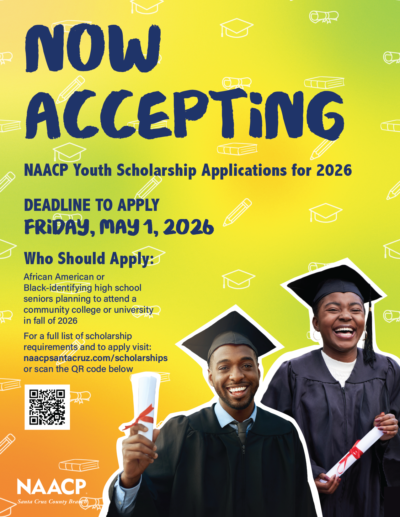 The NAACP Santa Cruz County Branch is seeking to award scholarships to local Black-identifying high school seniors. Over the past 20 years, our branch has awarded thousands of dollars to the youth of our community. Our mission is to provide local Black youth support in their pursuit of post-secondary education.